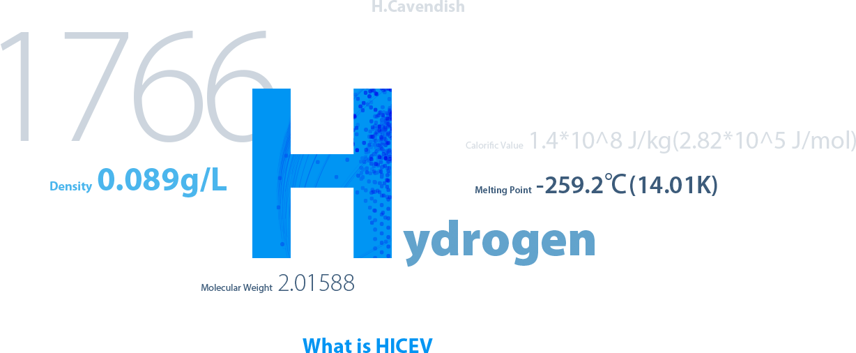 Molecular Weight 2.01588 H.Cavendish 1766 Density 0.089g/L Calorific Value 1.4*10^8 J/kg(2.82*10^5 J/mol) Melting Point -259.2℃(14.01K) ydrogen What is HICEV